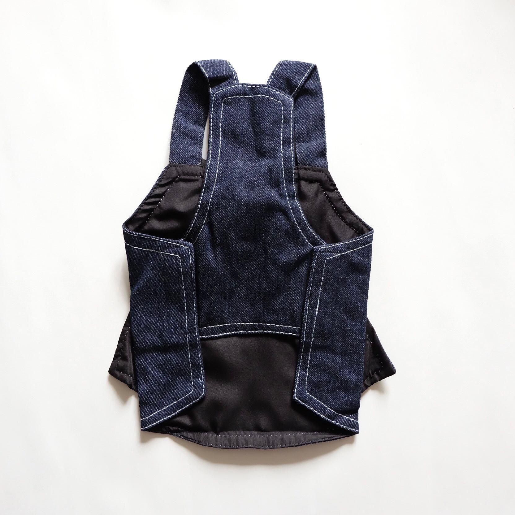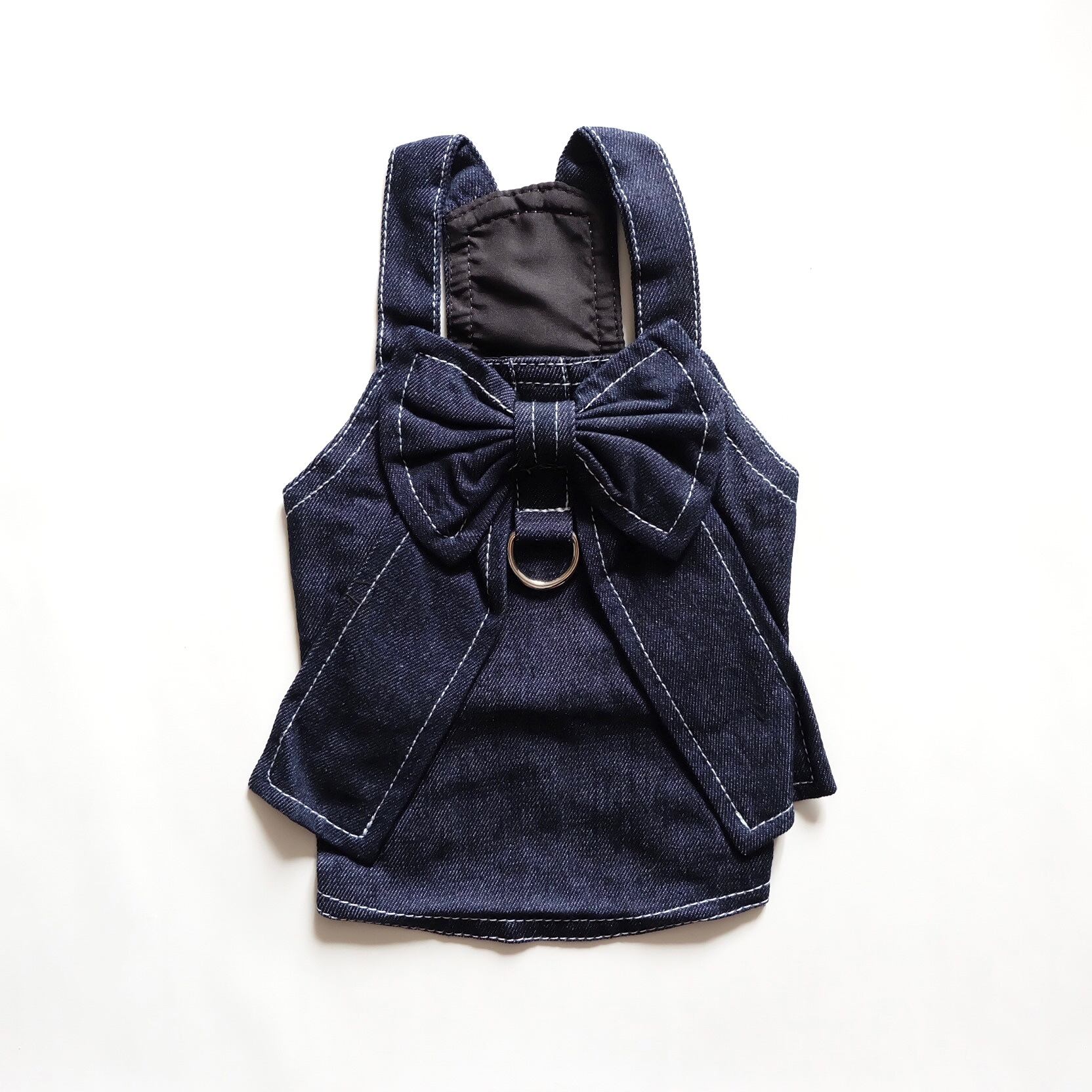 大きなバックリボンがかわいいデニム生地のキャミソール。背中にはフックが付いており、リードをつけてそのままお散歩に行けます◎お腹側にはマジックテープが付いているので、着脱も楽ちん。デニム生地ですが、それほど重量もなくワンちゃんに負担なく着用いただけます。下に薄手のトップスなど、重ね着も楽しめます。