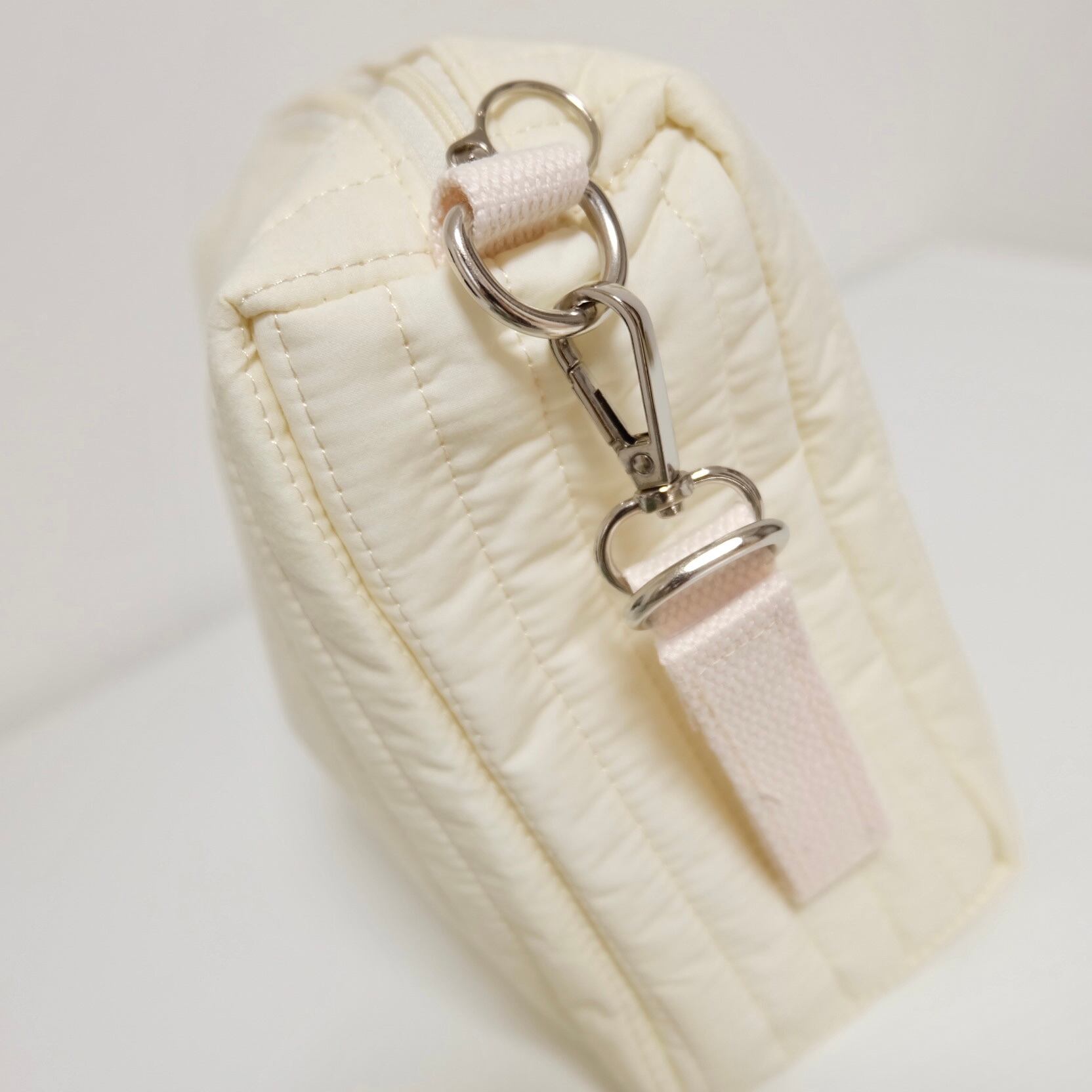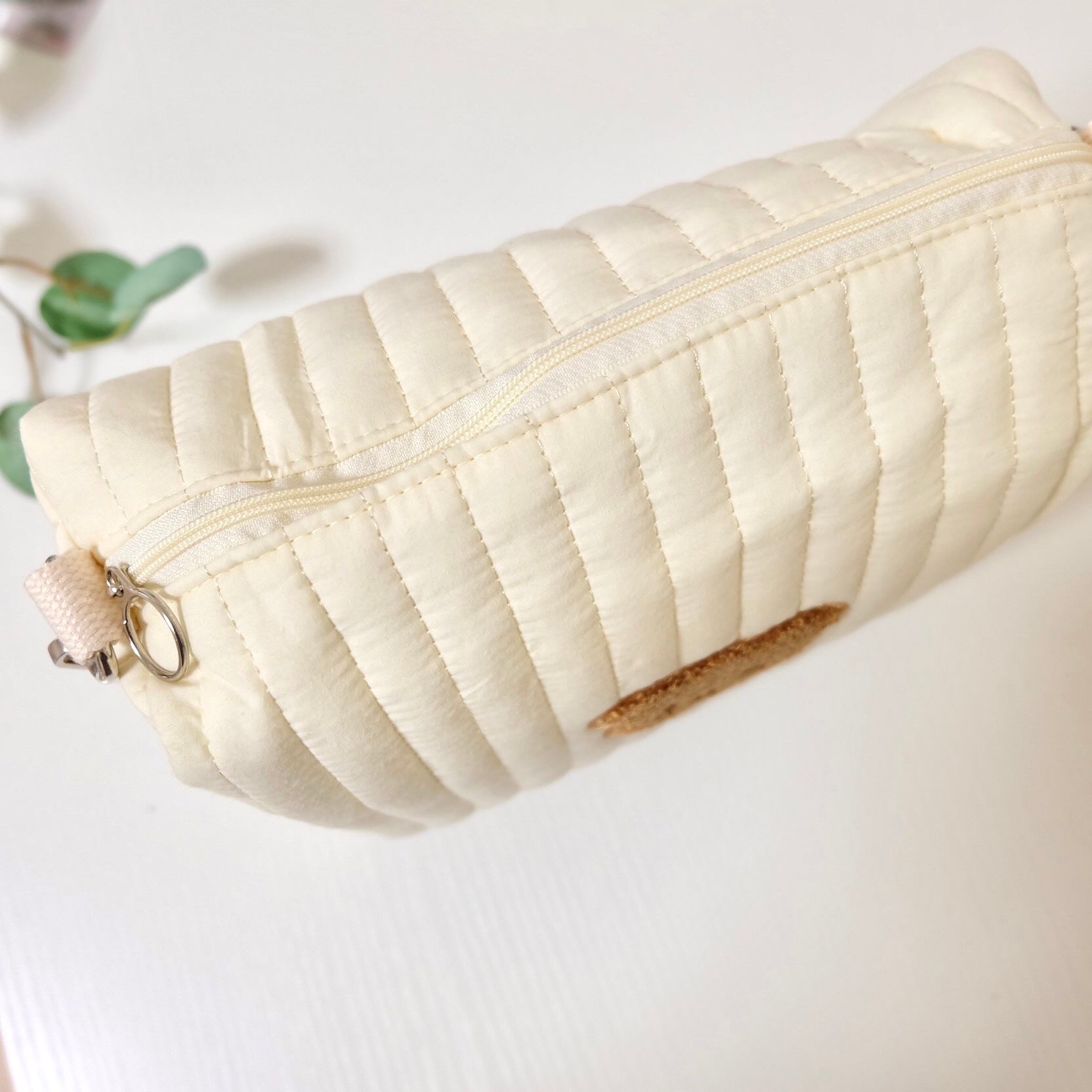 くまさん柄ワッペン付きのかわいいポーチ。マチがしっかりあり、大容量です。旅行の時や普段のお散歩など使い方は様々◎左右にあるストラップにはマジックテープが付いているので、ペットカートのフックなどにも固定できます。